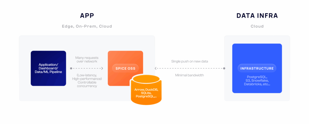 Rather than replacing your existing databases, Spice sits alongside your application and federates queries across multiple data sources. It materializes working datasets locally for sub-second performance while keeping your source of truth intact.