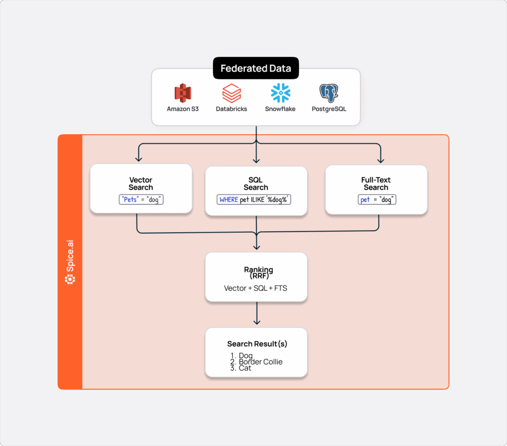 Spice provides built-in vector_search and text_search SQL functions that can be combined with standard SQL joins and a rrf() ranking function. This means keyword search, vector similarity, and RRF fusion all execute within the same query engine -- no external services, no multi-system orchestration. Results are ranked and returned in a single round-trip.
