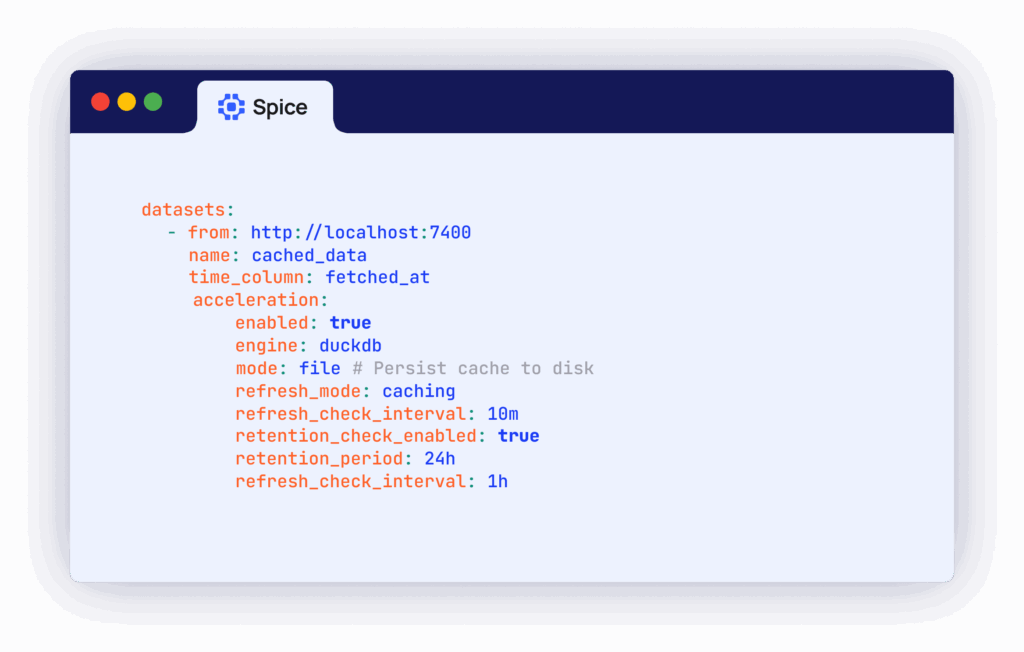 Spice's new caching acceleration mode provides stale-while-revalidate (SWR) behavior for accelerations with background refreshes, enabling file-persisted caching using Cayenne, DuckDB, or SQLite.