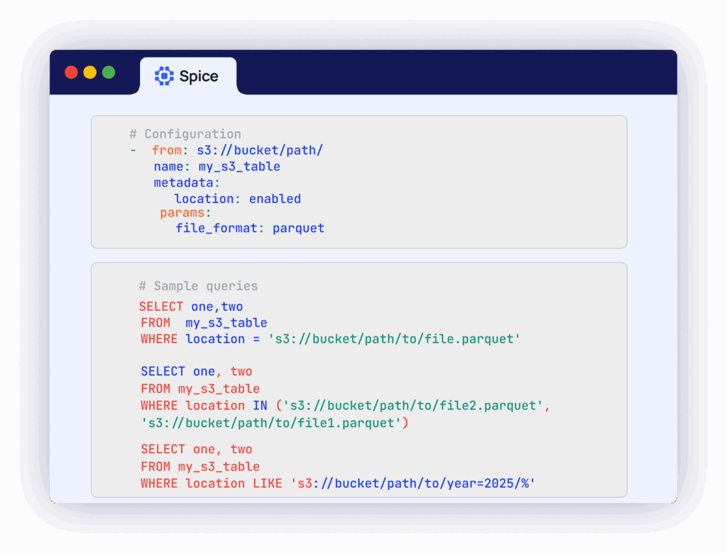 The S3 data connector now supports location-based predicate pruning - dramatically reducing data scanned by pushing down location filter predicates to S3 listing operations. And, AWS S3 Tables now have full read/write capability in Spice!