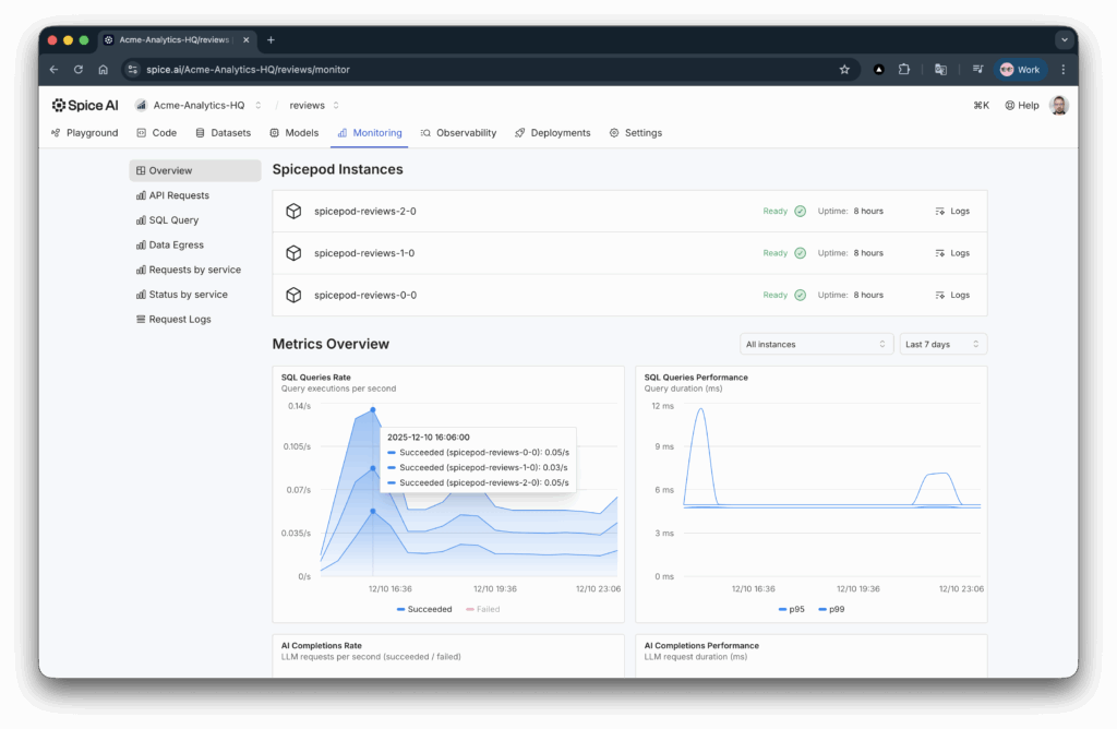 Spice Cloud customers will automatically upgrade to v1.10 on deployment, while Spice.ai Enterprise customers can consume the Enterprise v1.9.0 image from the Spice AWS Marketplace listing.